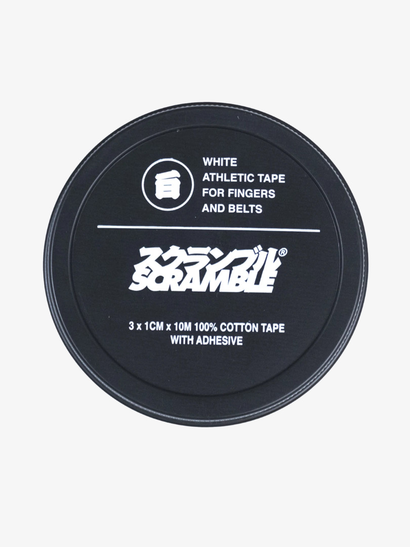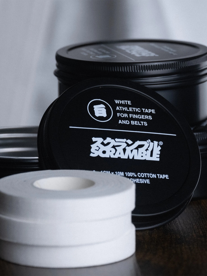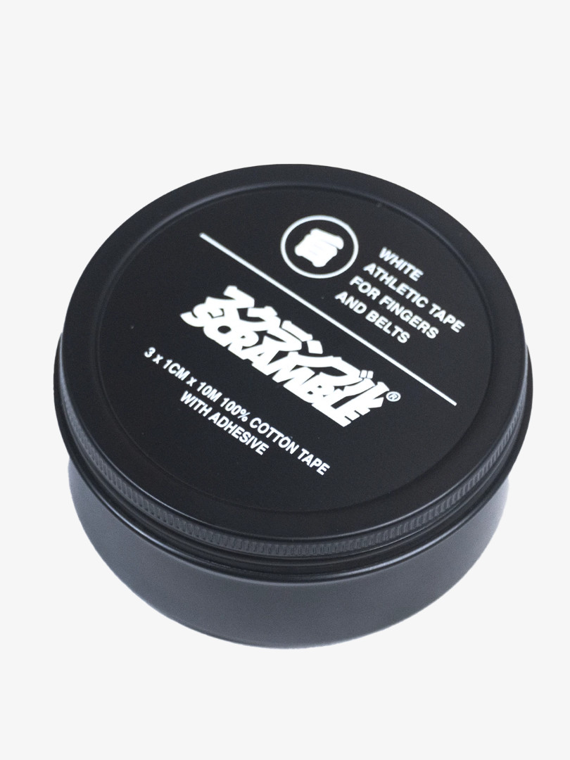 Zestaw trzech rolek w kolorze białym, o wymiarach 10m x 1cm, zapakowanych w metalową puszkę chroniącą taśmę przed zabrudzeniami.
